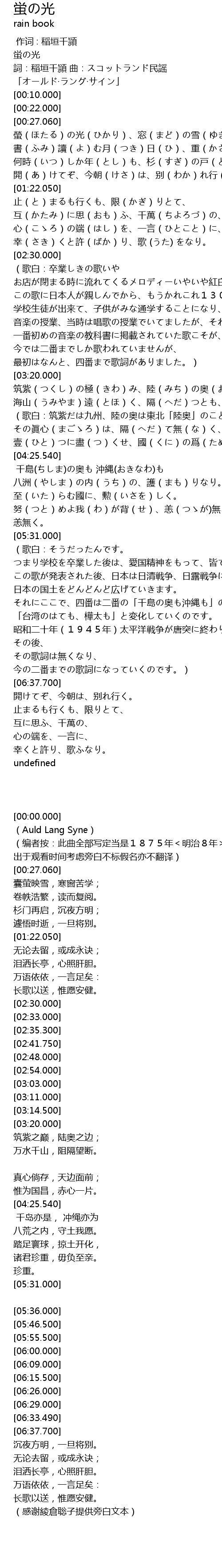 | [03:03.000] | 一番初めの音楽の教科書に掲載されていた歌こそが、この歌、蛍の光でした。 |
