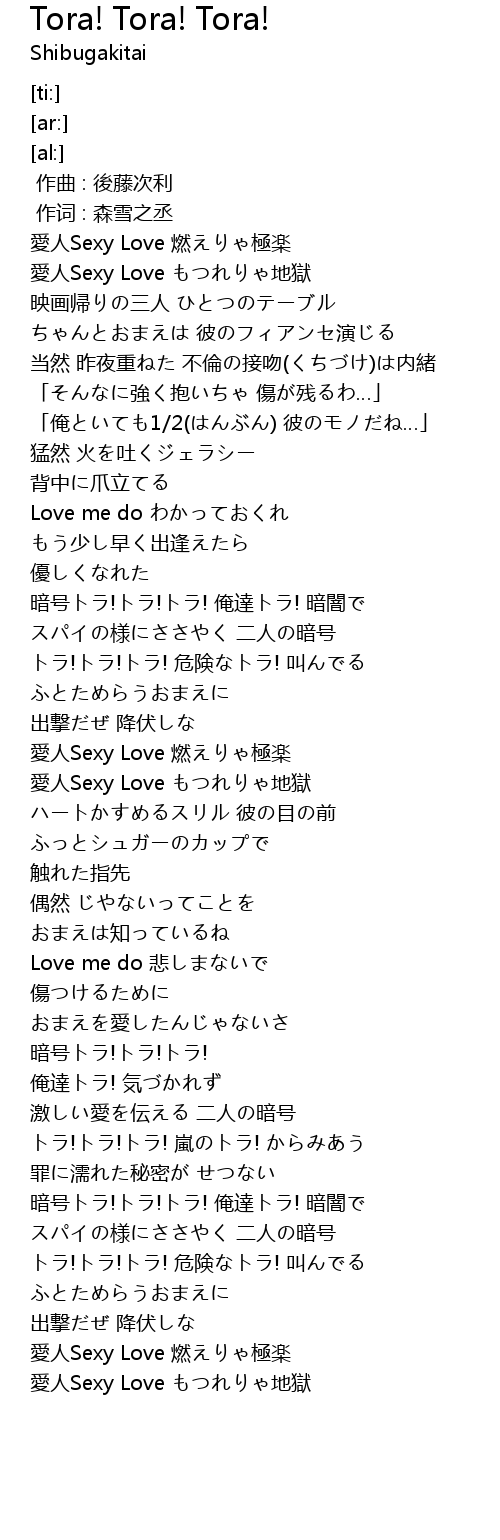 | [02:55.94] | 暗号トラ!トラ!トラ! 俺達トラ! 暗闇で |