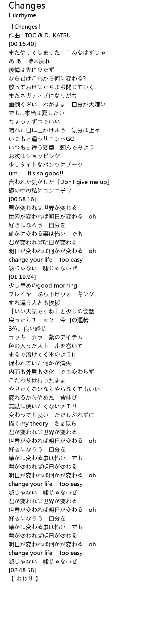 | [01:02.92] | 世界が変われば明日が変わる oh |
