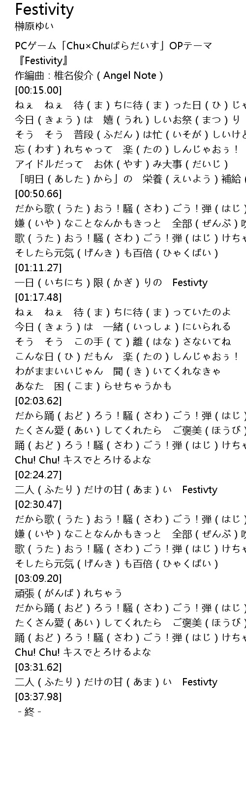 | [00:02.00] | PCゲーム「Chu×Chuぱらだいす」OPテーマ |