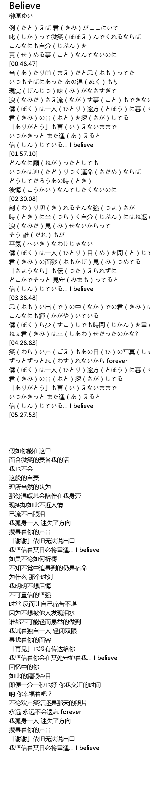 | [03:22.65] | どこかでそっと 見守(みまも)ってると 信(しん)じている… I believe |