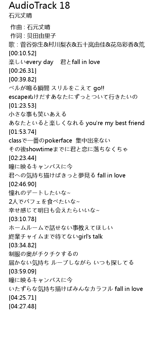 | [00:11.89] | 楽しいevery day 君とfall in love |