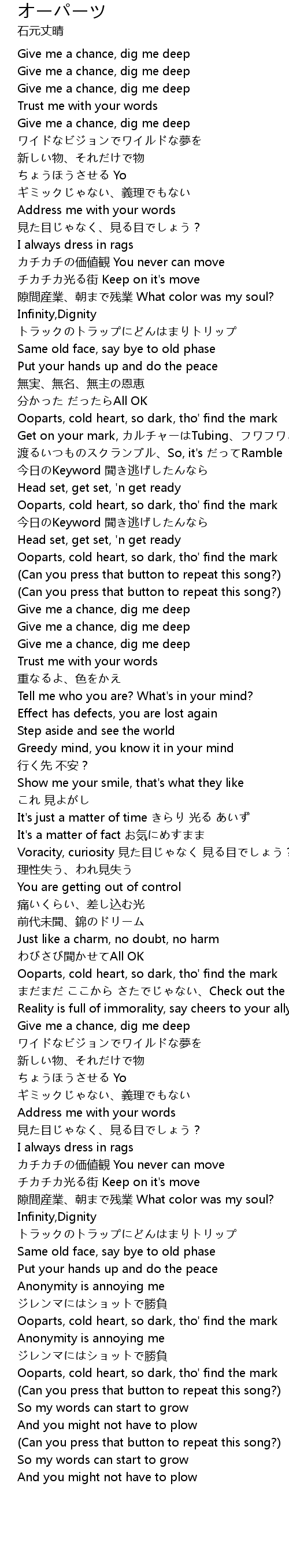| [02:18.96] | Ooparts, cold heart, so dark, tho' find the mark |