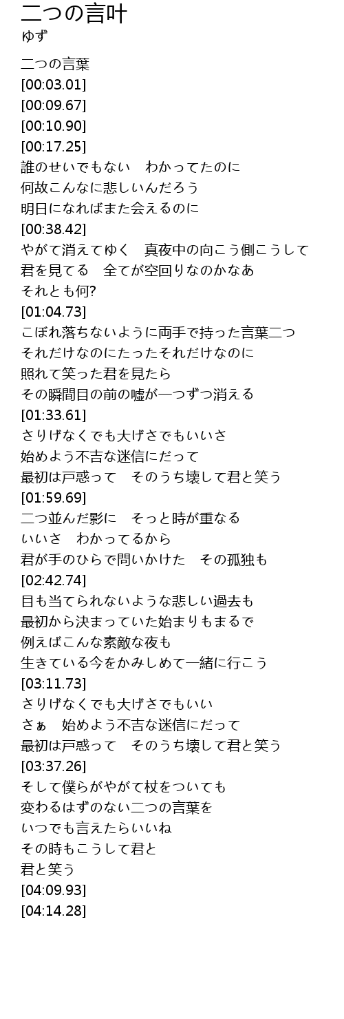 | [03:44.48] | 変わるはずのない二つの言葉を |