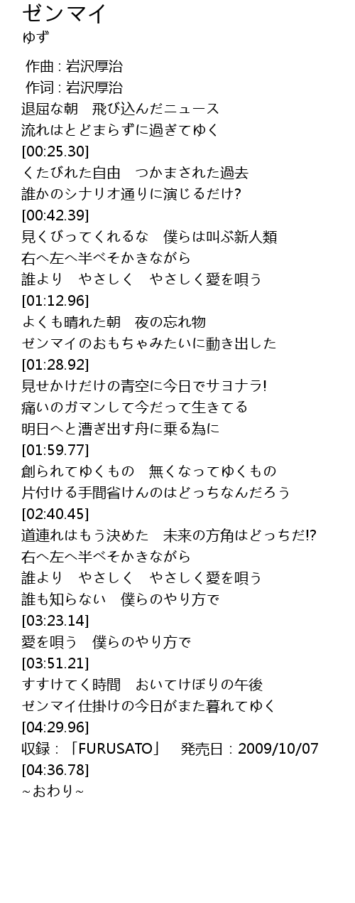 | [04:32.10] | 収録:「FURUSATO」 発売日:2009/10/07 |