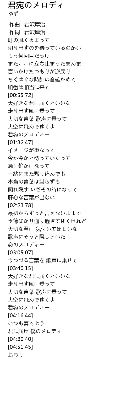 | [00:01.00] | 作词 : 岩沢厚治 |