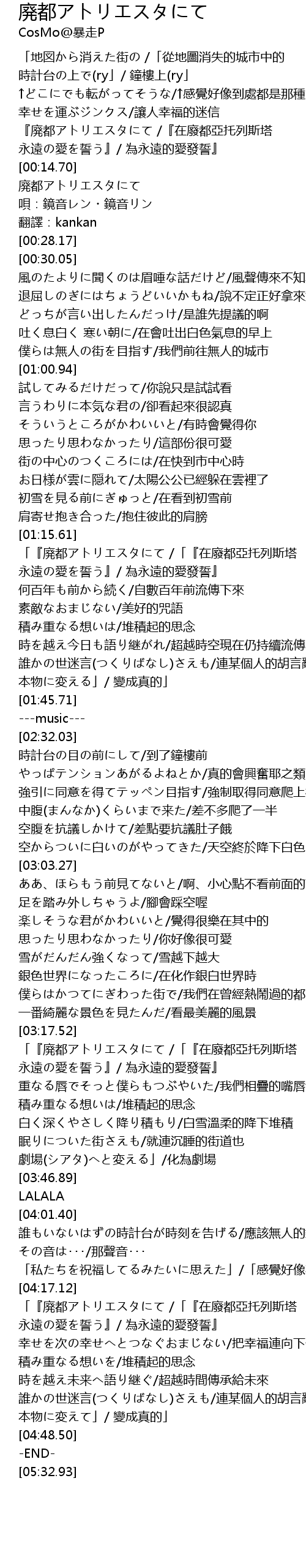 | [00:02.53] | 時計台の上で(ry」/ 鐘樓上(ry」 |