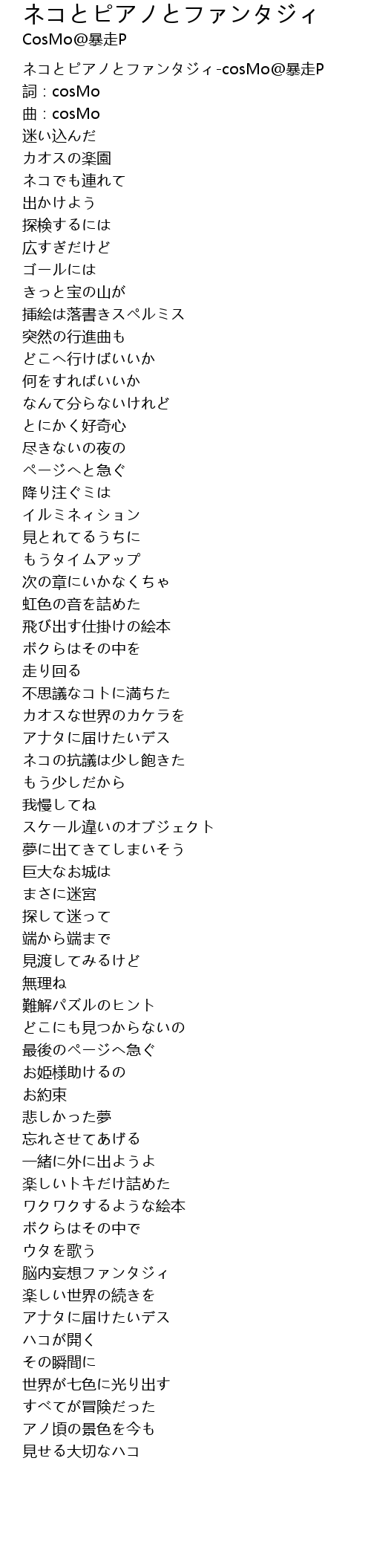 | [00:00.431] | ネコとピアノとファンタジィ-cosMo@暴走P |