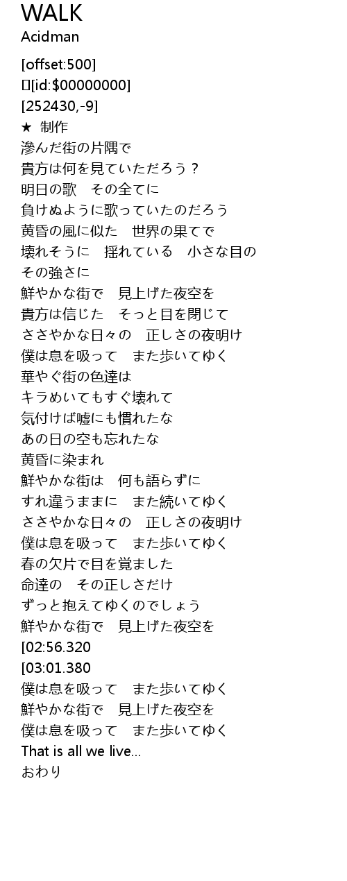 | [03:06.510] | 僕は息を吸って また歩いてゆく |