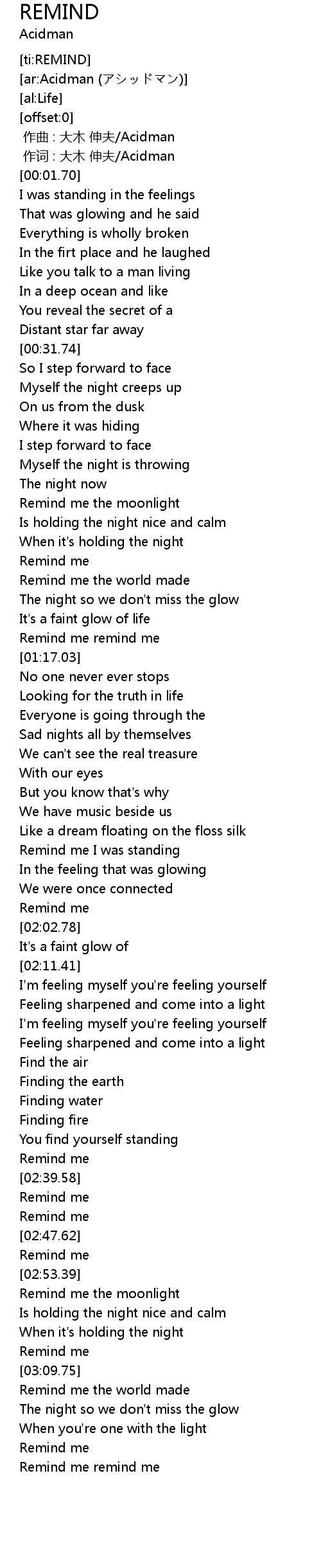 | [00:00.356] | 作词 : 大木 伸夫/Acidman |