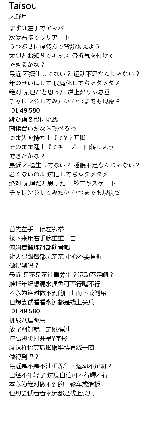 | [02:06.080] | つま先を持ち上げてY字开脚 |