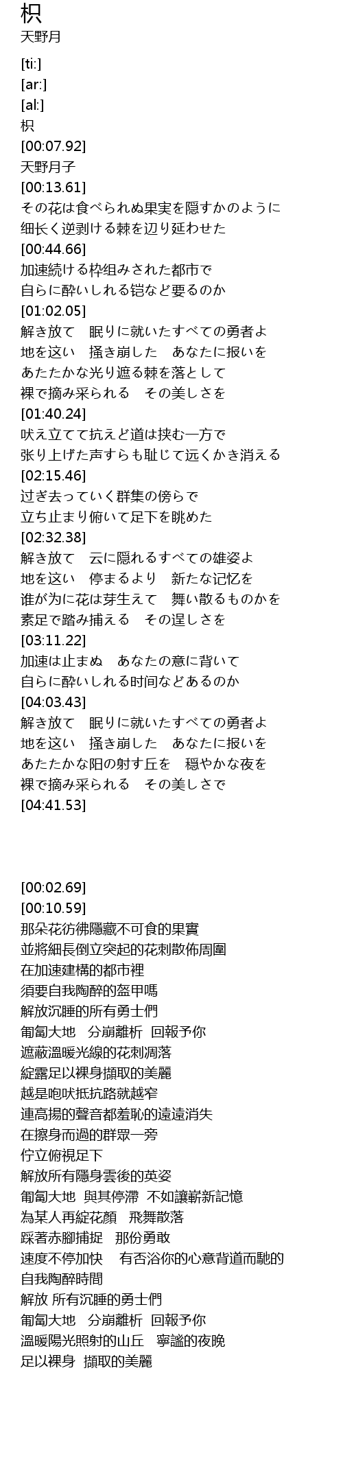 | [00:36.18] | 细长く逆剥ける棘を辺り延わせた |