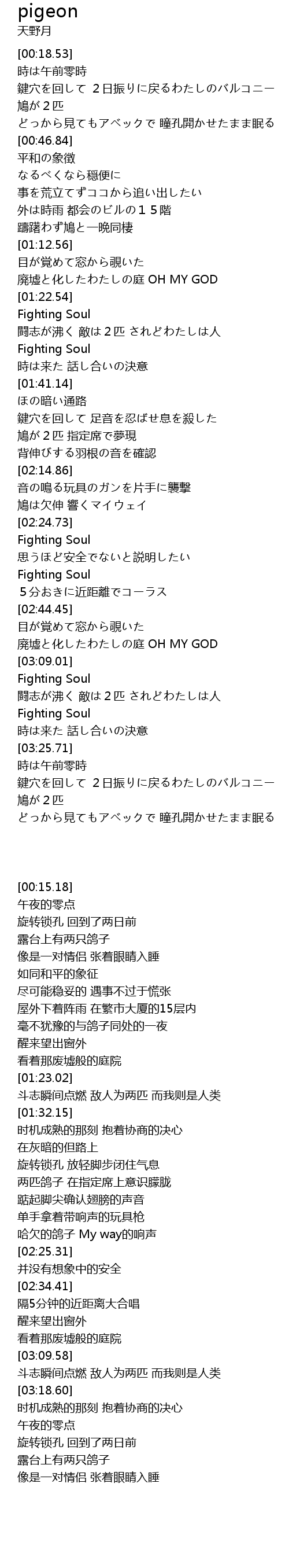 | [01:08.82] | 躊躇わず鳩と一晩同棲 |