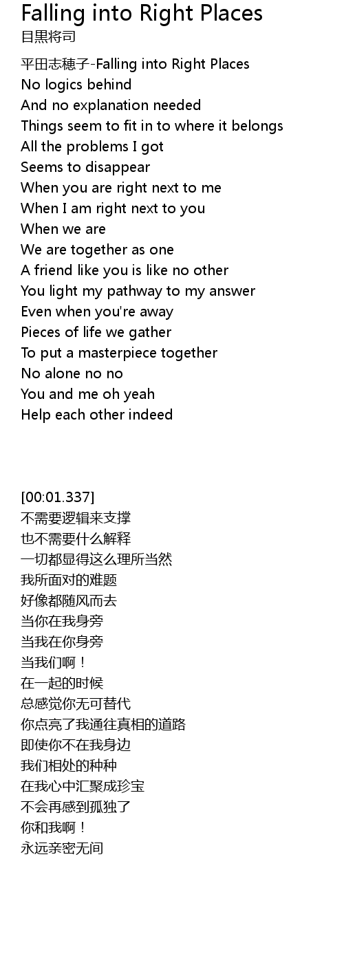 | [00:01.337] | ping tian zhi sui zi Falling into Right Places |