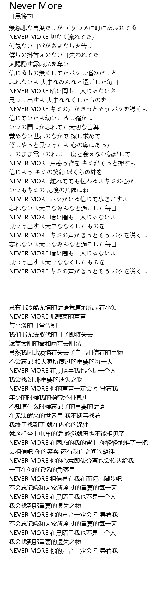 | [03:08.000] | NEVER MORE hù huò bèi yā |