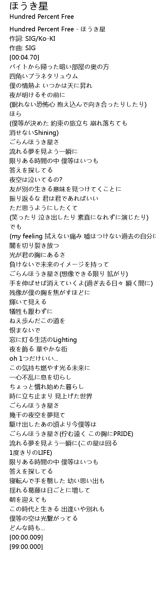 | [00:00.90] | Hundred Percent Free - ほうき星 |