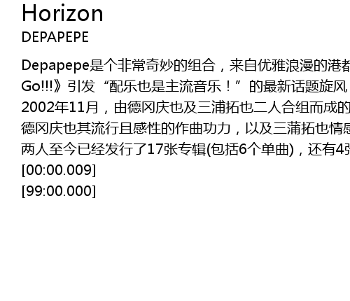 | [00:56.34] | 2002 nian 11 yue, you de gang qing ye ji san pu ta ye er ren he zu er cheng de DEPAPEPE, jin yi er ba kong xin ji ta jiu neng biao xian chu bian hua duo duan di xin xiang feng jing yi ji xi nu ai yue, yi yang yi zhe qing chun qi xi de qing kuai qu feng xuan lv, tan zou chu shu huan ren xin de yin yue kong jian, ru ci yi ji ta ge chang de xiao ying zheng zai xun su man yan kuo san zhong! cong shen hu dao da ban jing du yi ji dong jing, sui zhe jie tou biao yan de jing yan lei ji, DEPAPEPE shun jian kai qi le zhi ming du ji ren qi! |