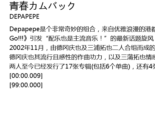 | [00:56.34] | 2002 nian 11 yue, you de gang qing ye ji san pu ta ye er ren he zu er cheng de DEPAPEPE, jin yi er ba kong xin ji ta jiu neng biao xian chu bian hua duo duan di xin xiang feng jing yi ji xi nu ai yue, yi yang yi zhe qing chun qi xi de qing kuai qu feng xuan lv, tan zou chu shu huan ren xin de yin yue kong jian, ru ci yi ji ta ge chang de xiao ying zheng zai xun su man yan kuo san zhong! cong shen hu dao da ban jing du yi ji dong jing, sui zhe jie tou biao yan de jing yan lei ji, DEPAPEPE shun jian kai qi le zhi ming du ji ren qi! |