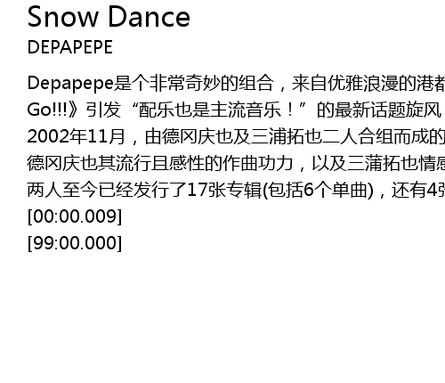 | [00:56.34] | 2002 nian 11 yue, you de gang qing ye ji san pu ta ye er ren he zu er cheng de DEPAPEPE, jin yi er ba kong xin ji ta jiu neng biao xian chu bian hua duo duan di xin xiang feng jing yi ji xi nu ai yue, yi yang yi zhe qing chun qi xi de qing kuai qu feng xuan lv, tan zou chu shu huan ren xin de yin yue kong jian, ru ci yi ji ta ge chang de xiao ying zheng zai xun su man yan kuo san zhong! cong shen hu dao da ban jing du yi ji dong jing, sui zhe jie tou biao yan de jing yan lei ji, DEPAPEPE shun jian kai qi le zhi ming du ji ren qi! |