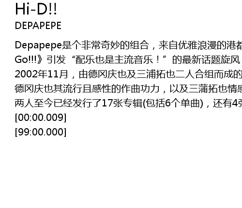 | [00:56.34] | 2002 nian 11 yue, you de gang qing ye ji san pu ta ye er ren he zu er cheng de DEPAPEPE, jin yi er ba kong xin ji ta jiu neng biao xian chu bian hua duo duan di xin xiang feng jing yi ji xi nu ai yue, yi yang yi zhe qing chun qi xi de qing kuai qu feng xuan lv, tan zou chu shu huan ren xin de yin yue kong jian, ru ci yi ji ta ge chang de xiao ying zheng zai xun su man yan kuo san zhong! cong shen hu dao da ban jing du yi ji dong jing, sui zhe jie tou biao yan de jing yan lei ji, DEPAPEPE shun jian kai qi le zhi ming du ji ren qi! |