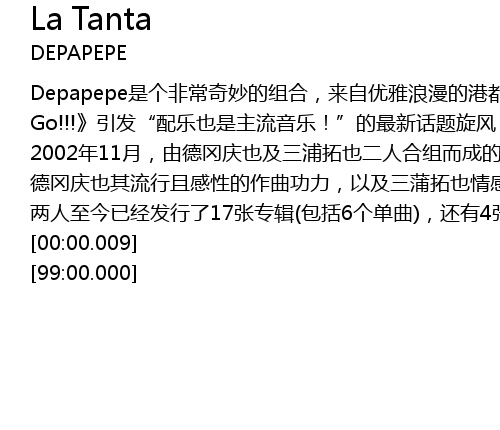 | [00:56.34] | 2002 nián 11 yuè, yóu dé gāng qìng yě jí sān pǔ tà yě èr rén hé zǔ ér chéng de DEPAPEPE, jǐn yǐ èr bǎ kōng xīn jí tā jiù néng biǎo xiàn chū biàn huà duō duān dì xīn xiàng fēng jǐng yǐ jí xǐ nù āi yuè, yǐ yáng yì zhe qīng chūn qì xī de qīng kuài qū fēng xuán lǜ, tán zòu chū shū huǎn rén xīn de yīn yuè kōng jiān, rú cǐ yǐ jí tā gē chàng de xiào yìng zhèng zài xùn sù màn yán kuò sàn zhōng! cóng shén hù dào dà bǎn jīng dū yǐ jí dōng jīng, suí zhe jiē tóu biǎo yǎn de jīng yàn lěi jī, DEPAPEPE shùn jiān kāi qǐ le zhī míng dù jí rén qì! |