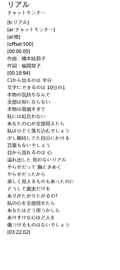 | [02:05.30] | 溢れ出した 形のないリアル |