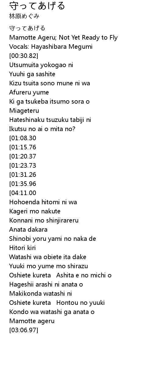 | [00:21.14] | Mamotte Ageru; Not Yet Ready to Fly |