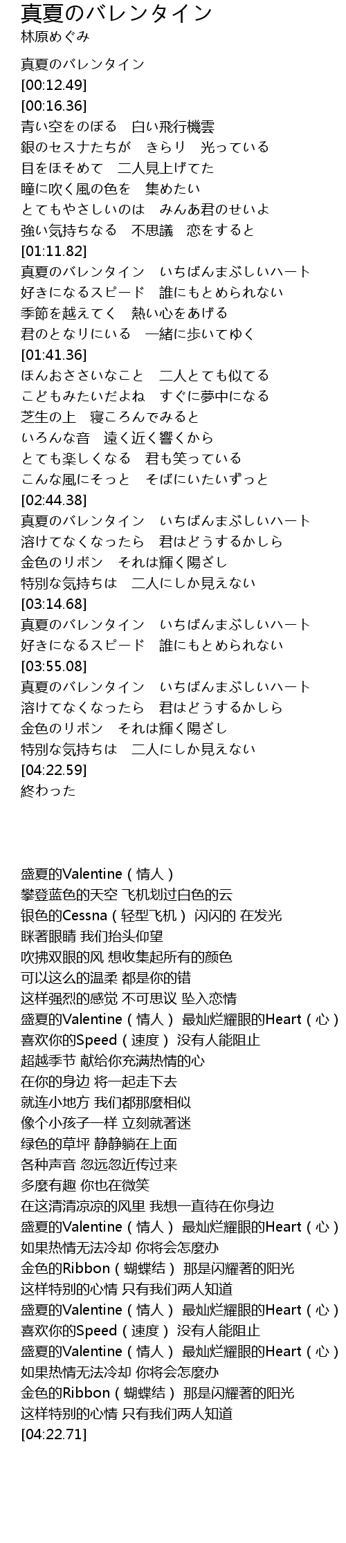 | [02:47.19] | 盛夏的Valentine(情人) 最灿烂耀眼的Heart(心) |