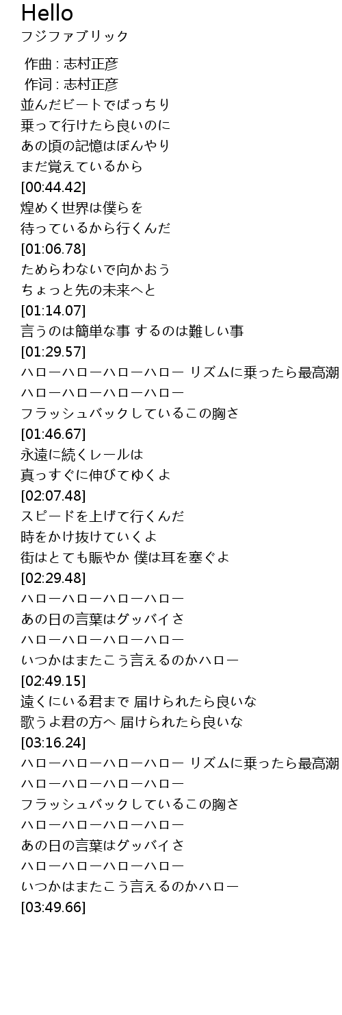| [02:39.68] | ハローハローハローハロー いつかはまたこう言えるのかハロー |