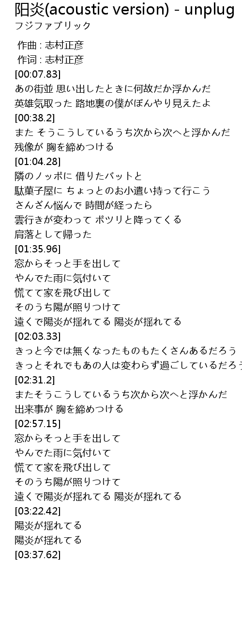 | [03:14.2] | 遠くで陽炎が揺れてる 陽炎が揺れてる |