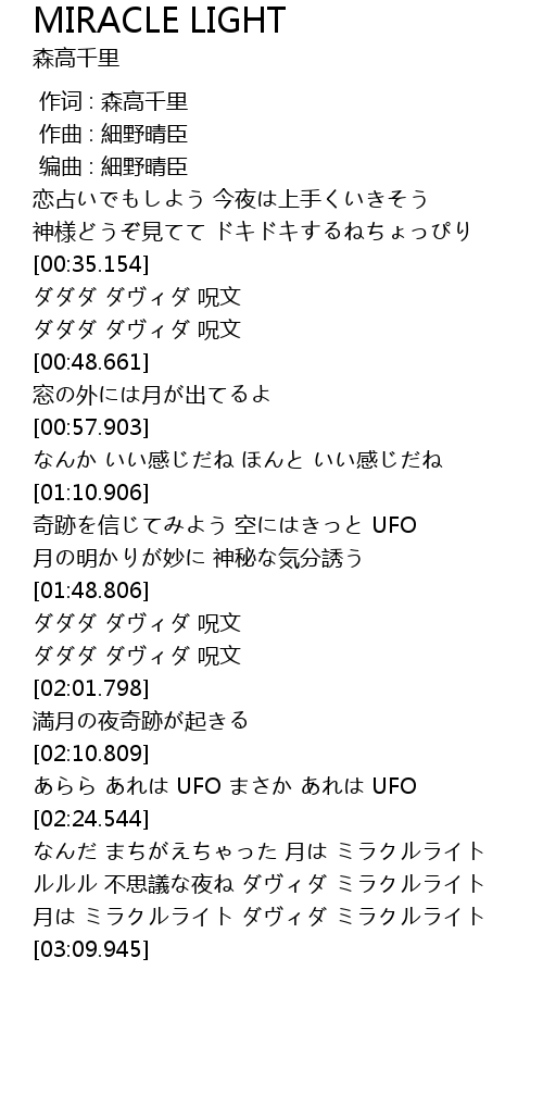 | [02:32.592] | なんだ まちがえちゃった 月は ミラクルライト |