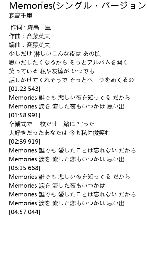 | [02:57.716] | Memories 涙を 流した恋もいつかは 思い出 |