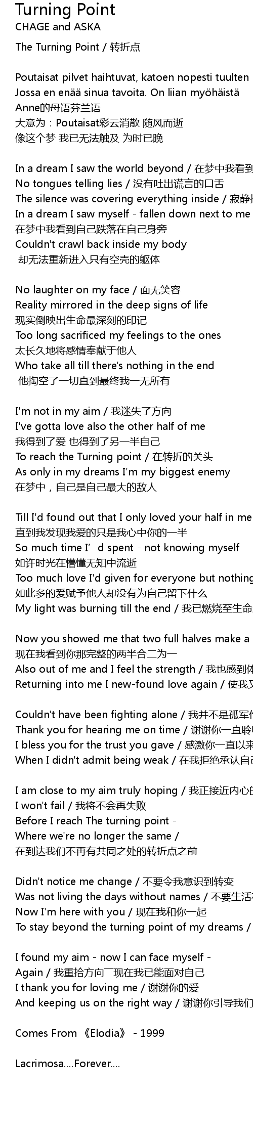 | To stay beyond the turning point of my dreams tíng liú zài mèng xiǎng de zhuǎn zhé diǎn | |