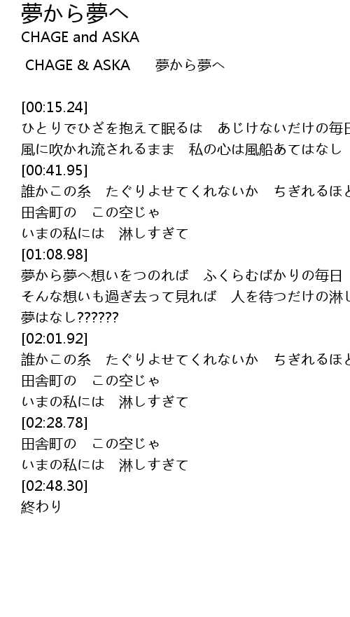 | [00:05.36] | CHAGE & ASKA 夢から夢へ |