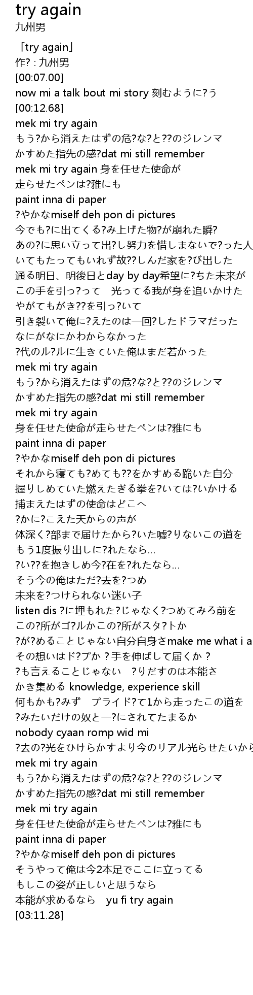 | [02:03.98] | listen dis ?に埋もれた?じゃなく?つめてみろ前を |