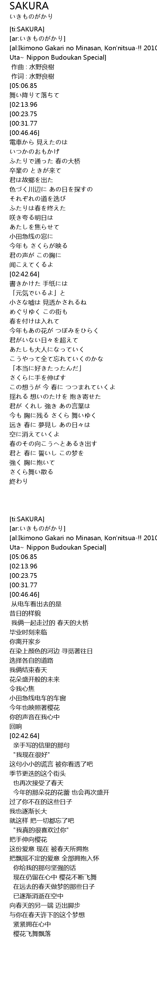 | [05:32.45][05:06.85][04:17.79][02:07.22][00:08.26] | さくら ひらひら 舞い降りて落ちて |