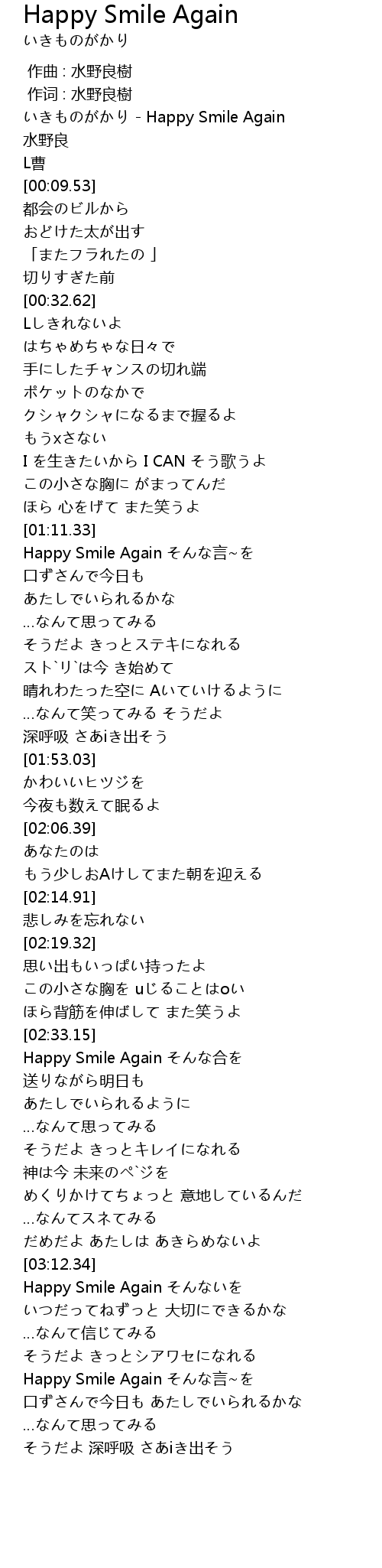 | [00:00.68] | いきものがかり - Happy Smile Again |