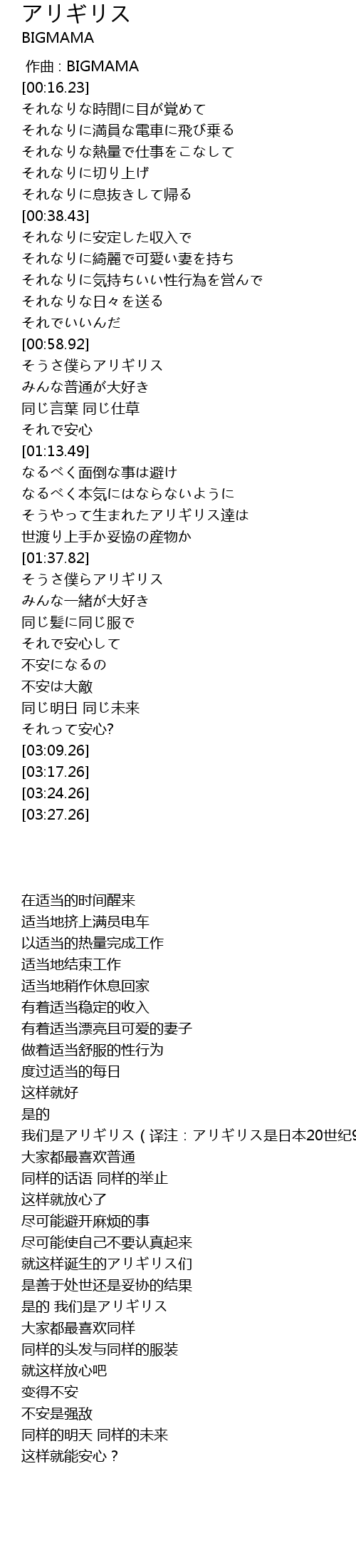 | [00:59.45] | 是的 我们是アリギリス(译注:アリギリス是日本20世纪90年代出现的俗语,是伊索寓言中《蚂蚁与蚱蜢(アリとキリギリス)》的合成语。指适当工作并适当休息的人。) |