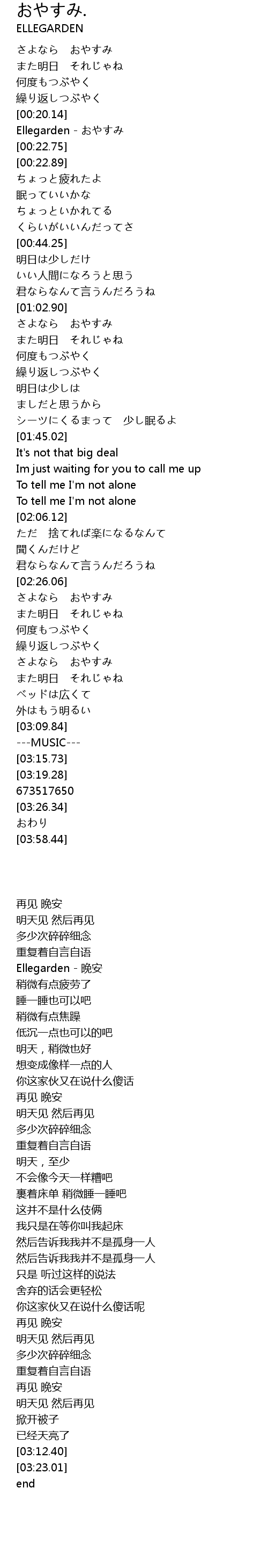 | [01:34.21] | シーツにくるまって 少し眠るよ |