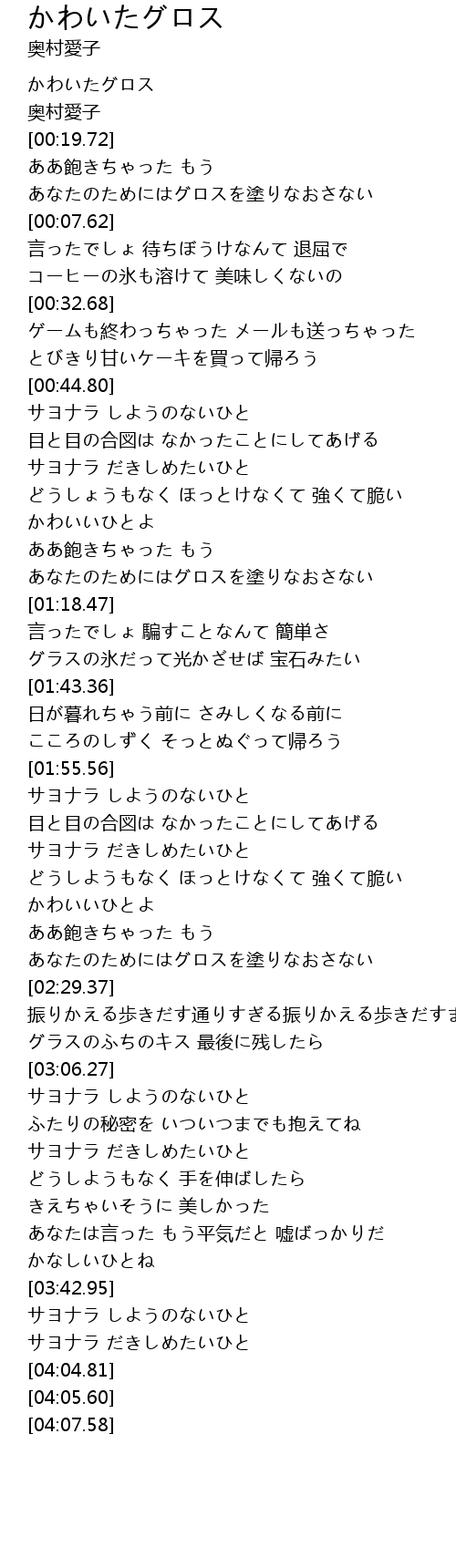 | [00:00.48] | ああ飽きちゃった もう あなたのためにはグロスを塗りなおさない |