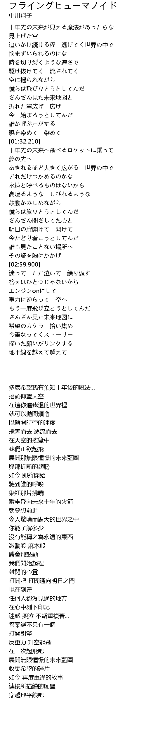 | [01:43.390] | 十年先の未来へ飛べるロケットに乗って |