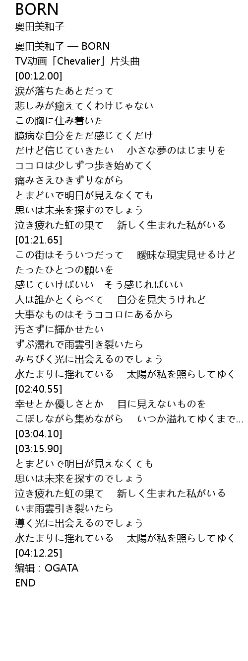 | [03:39.10] | 泣き疲れた虹の果て 新しく生まれた私がいる |