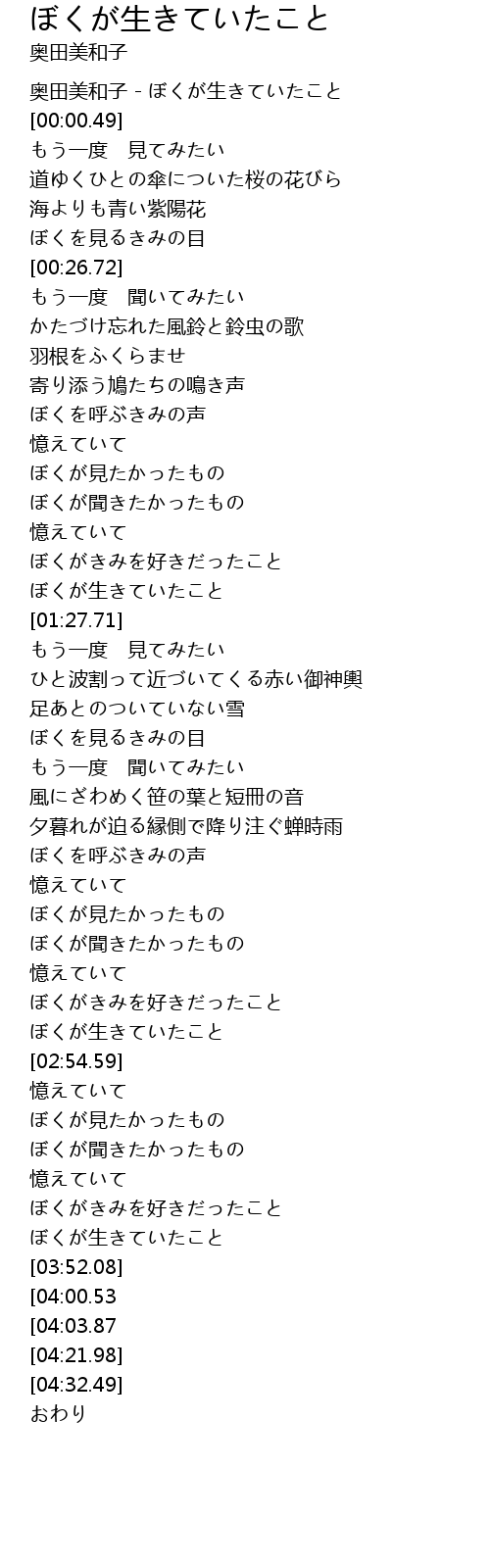 | [00:00.00] | 奥田美和子 - ぼくが生きていたこと |