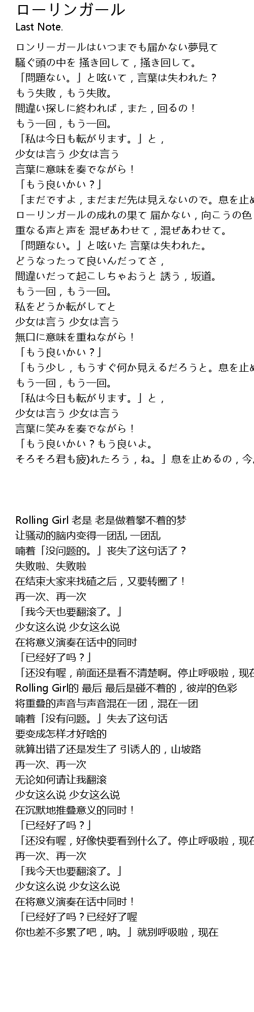| [01:49.01] | Rolling Girl的 最后 最后是碰不着的,彼岸的色彩 |