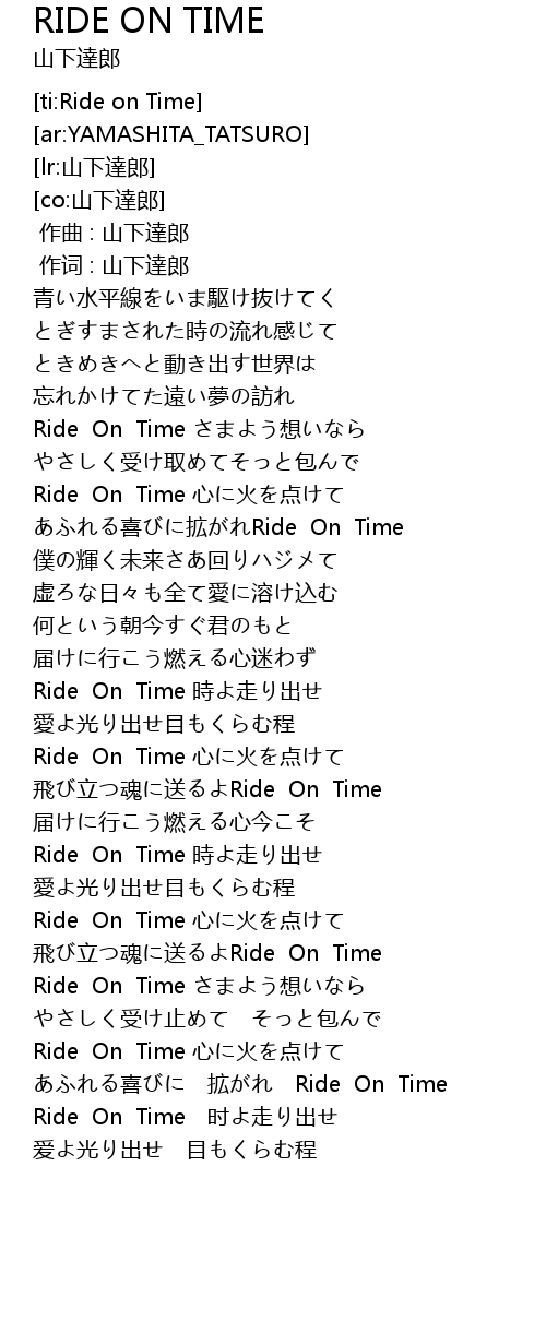 | [04:00.932] | Ride On Time shí zǒu chū |