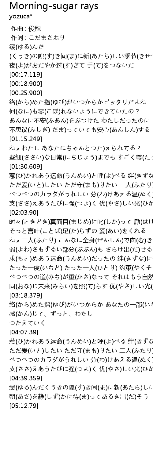 | [04:22.349] | べつべつのカラダがうれしい 分(わ)けあえる温(ぬく)もり |