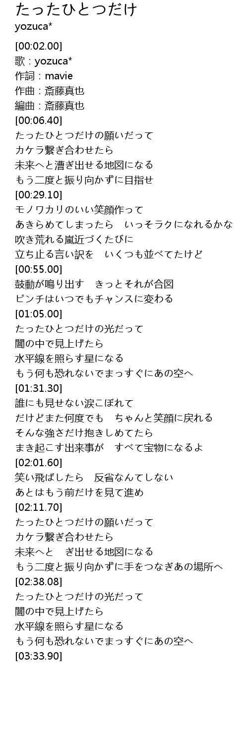 | [02:11.80] | たったひとつだけの願いだって |