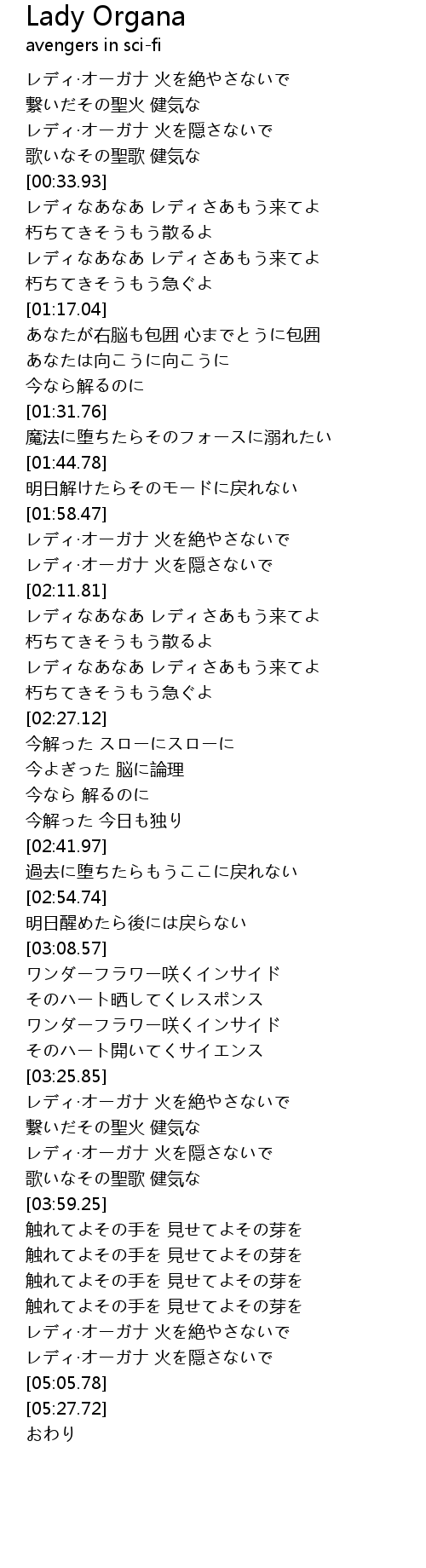 | [01:59.32] | レディ·オーガナ 火を絶やさないで |