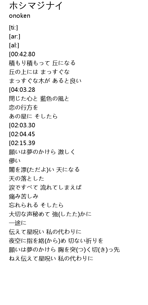 | [05:12.43] | ねえ伝えて星呪い 私の代わりに |