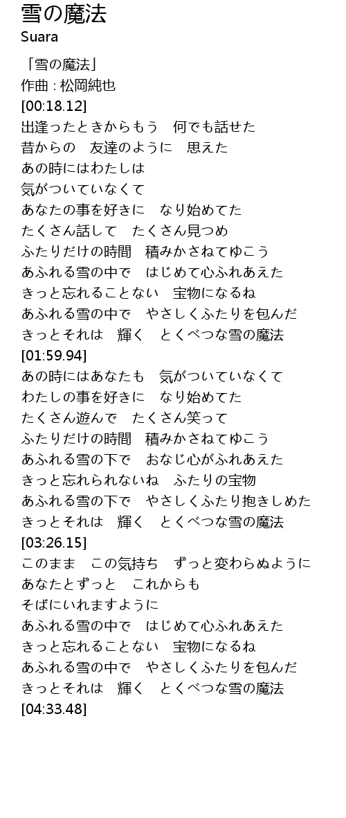 | [04:19.59] | きっとそれは 輝く とくべつな雪の魔法 |